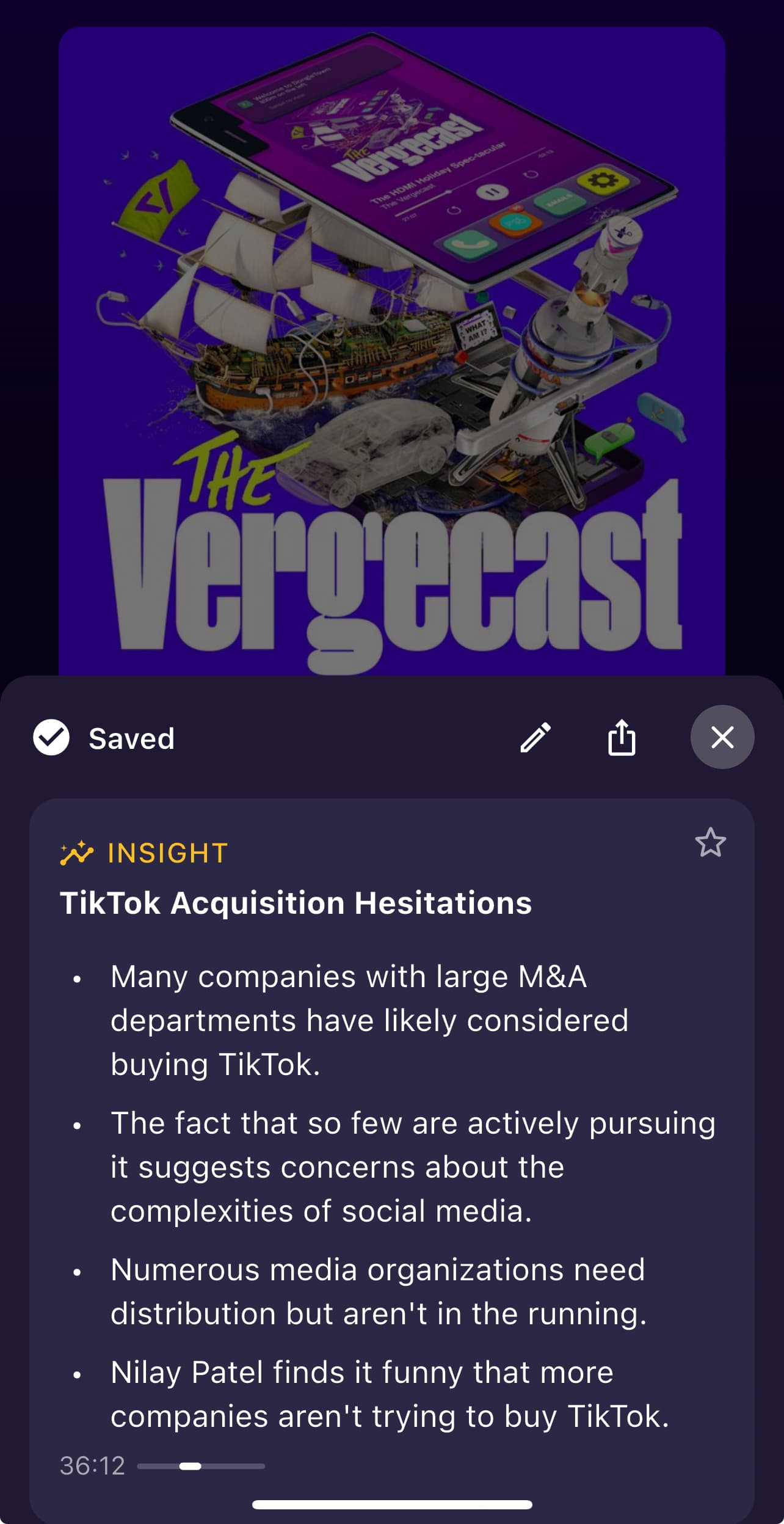 When you "create a snip," the app's AI knows to go back just slightly to capture the entire idea so you don't miss anything. Each snip includes both an AI overview (in bullet points) and the actual transcript from that section of the podcast.